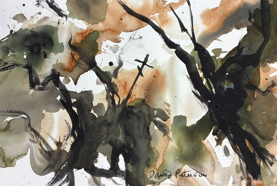 "Winding Way", 22x15"watercolor. Accepted to "Abstract Intentions", an exhibit at Sacramento Fine Arts Center October 28-November 22, 2025. As I was looking up while driving in traffic I was inspired to create this image.
