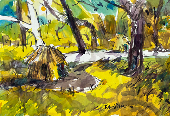 "Maidu Huts", 22"x15" watercolor plein air alla prima. Donated to be auctioned at Effie Yeaw Nature Centers 16th Annual Gala Fundraiser, "Fall Feast in the Forest", Sunday, September 28, 2025.
