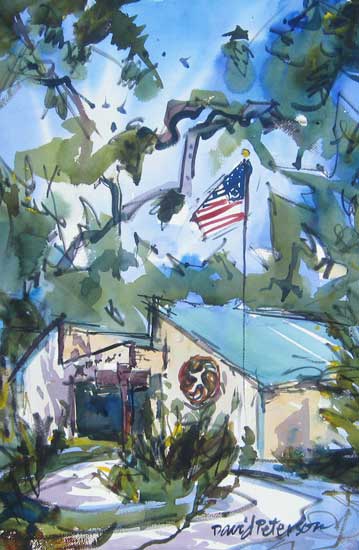 "Effie Yeaw Nature Center", watercolor, 22"x15" by David Peterson. Plien Air painting at Effie Yeah Nature Center. # 1932, painted early summer 2010 on a quite afternoon. The County flag no longer flies!