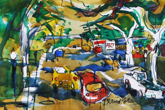 "Jay Street", #2187, 22"x15" by David Peterson. J Street plein air at its best. Watermedia, I used some acrylics. I painted this on a afternoon visit to a now defunct art gallery.