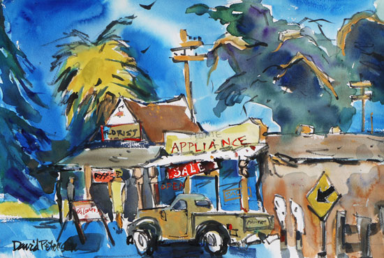 "Bob's Truck", watercolor, 22"x15" by David Peterson. Carmichael Plein Air. Sold. The appliance store has since burned down and the florist has moved.