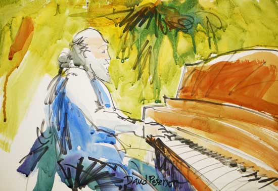 "Piano Man", #2778, watercolor, 22"x15" by David Peterson. Larry Lowe playing at the Arts Center.
