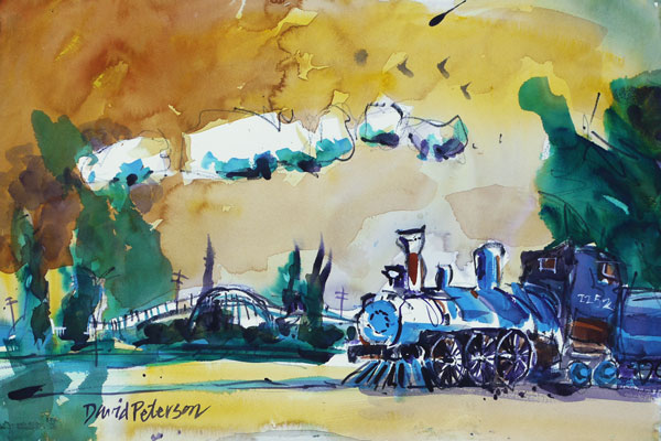 Exhibited Northern California Arts "Bold Expressions" at Sacramento Finearts. "Engine 2252", watercolor on paper, 22"x15". This is a scene in Roseville, CA. For sale, $485, framed.