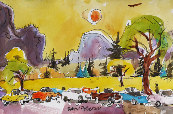 "Yosemite Car-Toon", Sometimes you can't ignore the cars, 22"x15" watercolor, Yosemite in August at mid day. This work has been sold to and is at Eskaton Village, Carmichael.