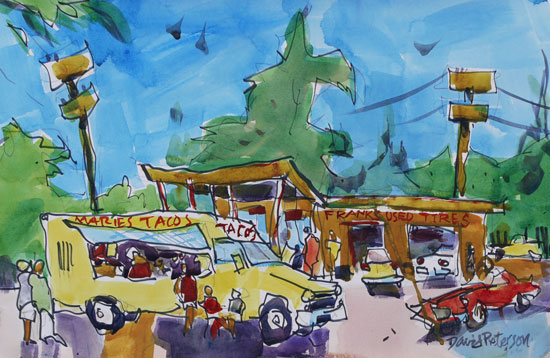 "Marie's Tacos", #3037, 22"x15", watercolor, somewhere in Fruitridge. For Sale, $485 framed.
