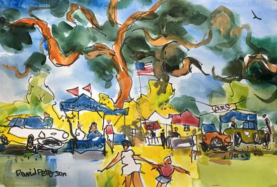 This watercolor, #3298, 22"x15" by David Peterson, was sketched in Carmichael Park at the 109th Carmichael Founders Day and later painted with the left hand. This one is still available for sale.