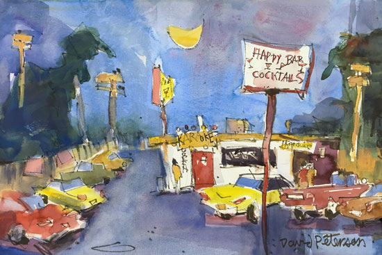 In the mood for karaoke? "Happy Bar" on Bradshaw just south of Jackson Road. 22x15 watercolor. Been there? Watercolor #3330, framed $500.