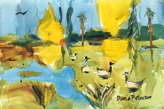 Watercolor #3561, Another version of "Mather Lake", 22x15" watercolor. Painted at Barasserie du Munde July 14, 2021 at a Plein Air Sac event as a demo.