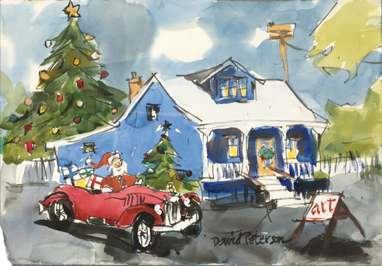"Santa's Visit", 22x15" watercolor. Painting of the Month awarded by WASH, Inc. Showed through December at SacArts. Depicted is Santa visiting Annies Gallery in his old car. SOLD