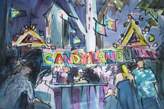 Watercolor No. 1299, "Candyland II", 22" x 15", Painted at the Fair on August 27-28, 2008. For sale, framed, $400.