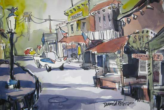 Watercolor No. 1689, "Sutter Street Plein Air", painted on site in Folsom October 17, 2009. 22"x15", framed 29"x22". $500.00.