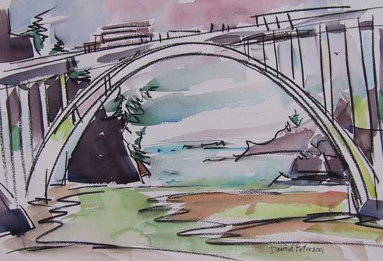 No. 287, "Kenneth's Bridge", August 14, 2003. Russian Gulch Bridge, Mendocino. 4th place at the 25th Annual WASH Members Show. Watercolor, 22x15, Private Collection ©2003 David Peterson