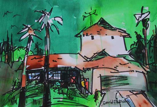 No. 396, "La Riviera Drive", Sacramento, CA. June 11, 2004. Watercolor and ink, 22 x 15". Framed and for sale, $550.00. ©2004 David Peterson