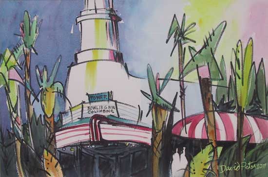 No. 467, "Bowling For Columbine" . November 9-10, 2004. Watercolor, 22"x15". Available. ©2004 David Peterson