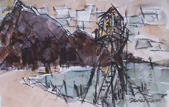 No. 512, "Manzanar Tower", May 1, 2005. Watercolor and charcoal, 22 x 15". Available.