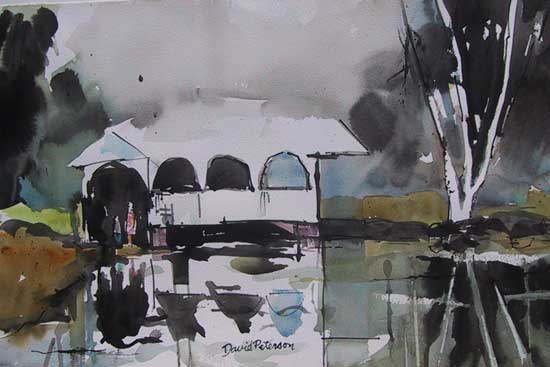 No. 550, "Bridge of Humidity", Watercolor, ink, 22" x 15". Painted in Mass'tts, July 18, 2005. For sale. Exhibited Rancho Cordova Cuty Hall August-October 2019. © 2005 David Peterson