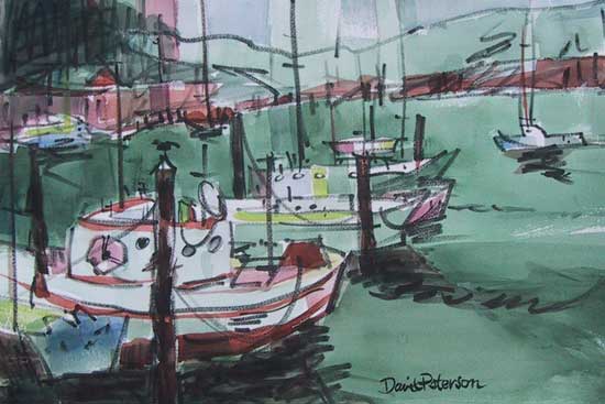 No. 565, "Noyo Harbor, Green", Watercolor and Ink Marker, 22" x 15". Painted August 10, 2005. For Sale.