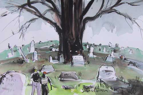 No. 569, "Mendocino Cemetery Visitors", Watercolor, Ink, 22" x 15". August 9, 2005. For sale. © 2005 David Peterson