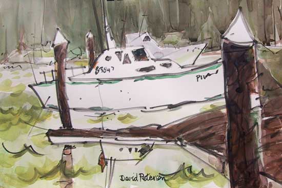 No. 612, "White Boat, Ft. Bragg South Harbor". December 1, 2005. Watercolor and Ink, 22" x 15". Available. ©2005 David Peterson
