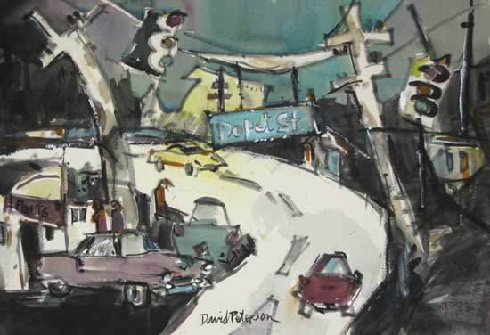 No. 982, "Depot Street", November, 2007. Watercolor, 22" x 15". $400.00 framed. This could be your town.